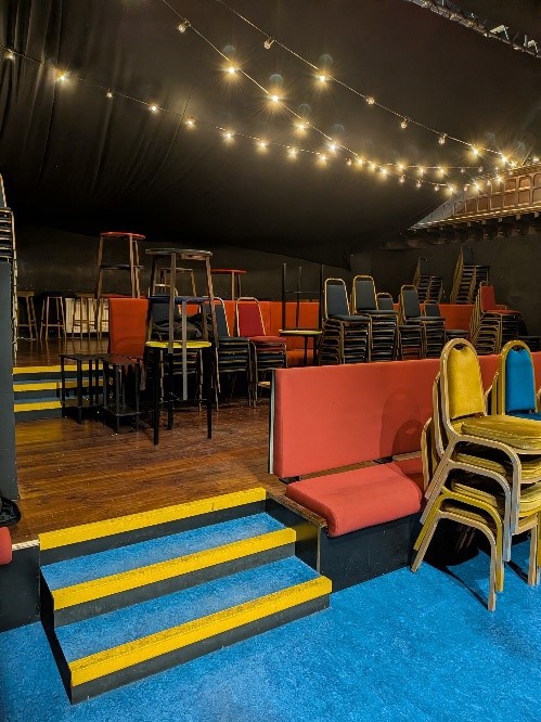 Access is via stairs at the front of the building. The stairs are well lit and in good condition. Seven steps down, turn 90deg, then two more steps to gain access. Staff are always available to assist, however we cannot help to carry customers. Advance notice is appreciated - email [email protected] or by phone on 0131 558 7272. There is Level access to backstage loo which is suitable for someone with minor mobility issues but it is not a full disabled toilet. We are happy to book a free of charge carer's ticket and to provide a queue jumping service so you can get in before the rest of the audience if you wish - to do this please contact us in advance to discuss by email on [email protected] . Due to fire regulations we can only have one wheelchair user in the premises at any time.